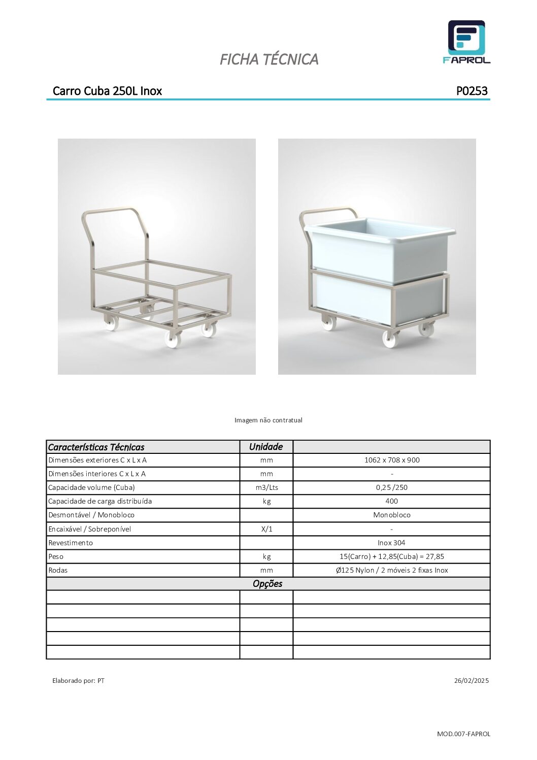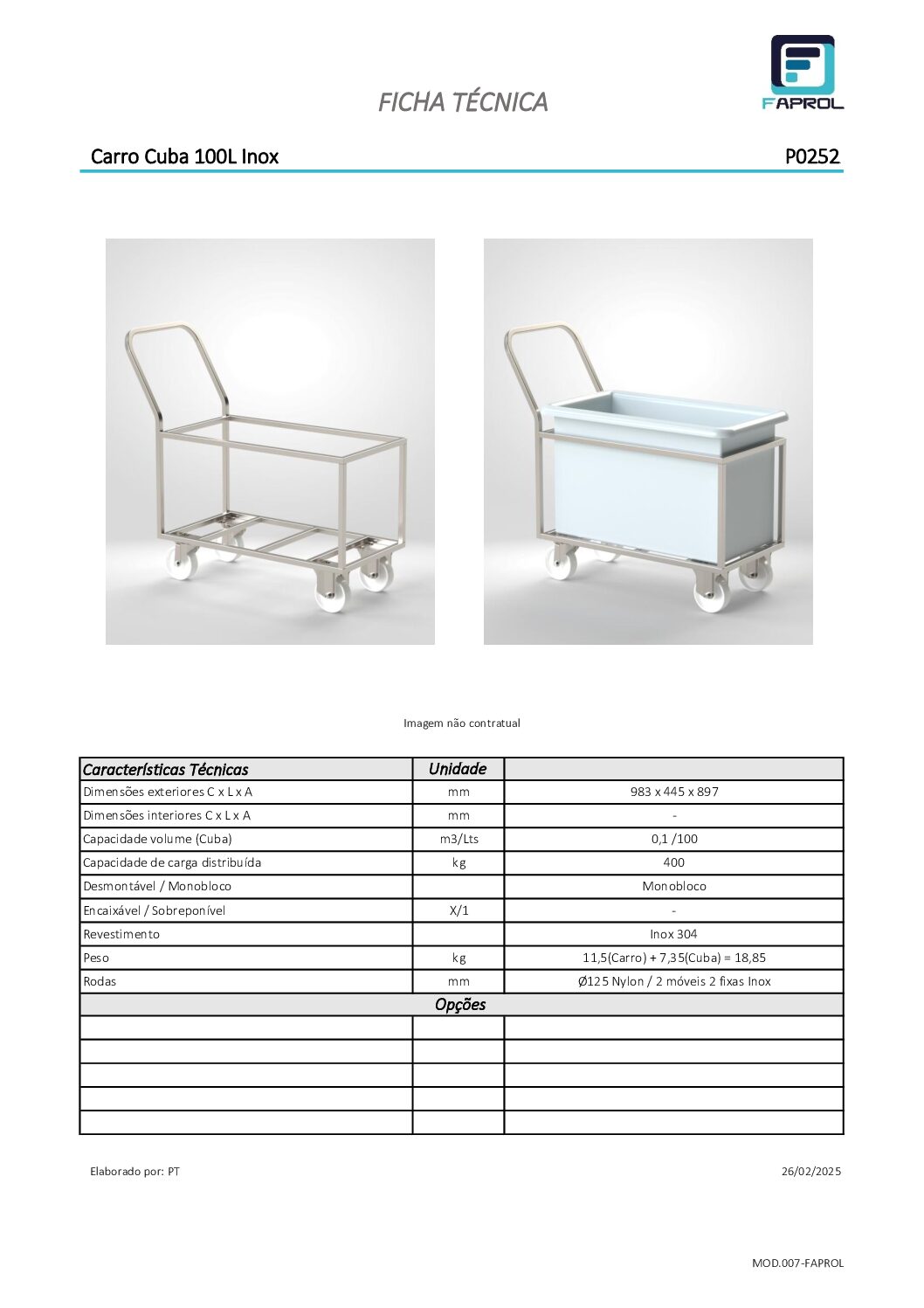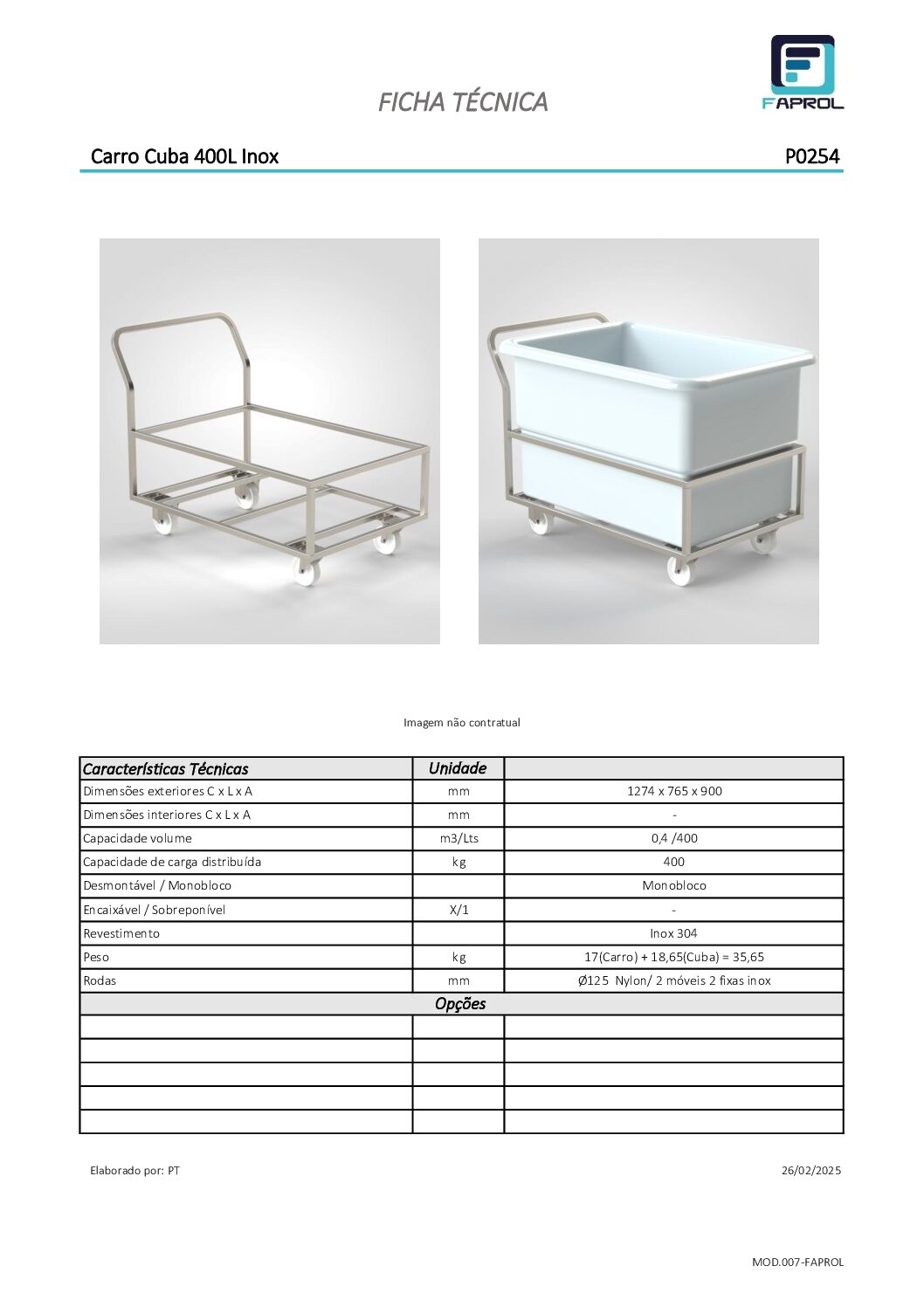 Chariot Blanchisserie 100L/250L/400L en acier inoxydable, structure monobloc, capacité de charge 400 kg.